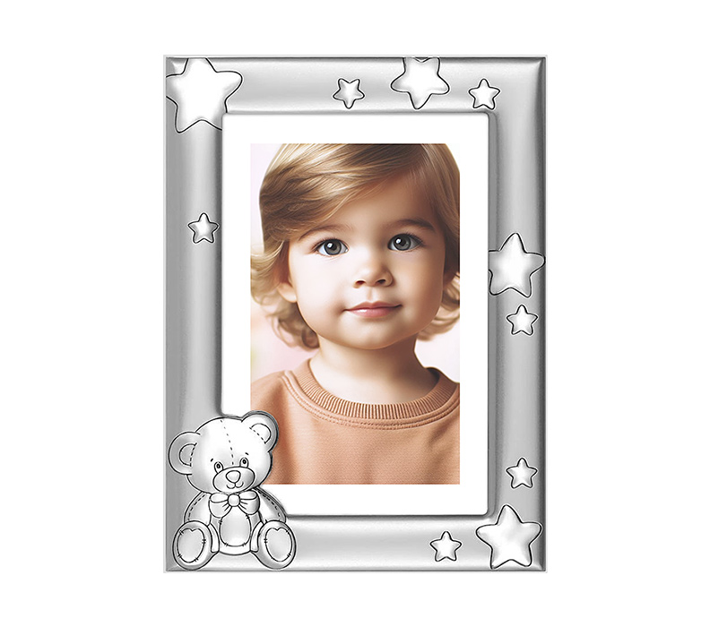 • Zauberhafter silberner Bilderrahmen, verziert mit einem niedlichen Teddybären und kleinen Sternen. Ein liebevoll gestaltetes Accessoire für das Kinderzimmer, das ein Lieblingsfoto auf besondere Weise in Szene setzt. Die Kombination aus glänzendem Silber und zarten Farben verleiht dem Rahmen einen warmen, kindgerechten Charakter. Perfekt als Geschenk zur Geburt, Taufe oder zum ersten Geburtstag.