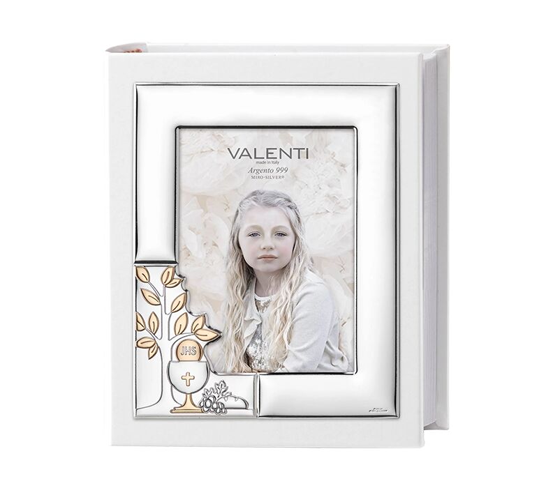 • Ein einzigartiges Fotoalbum, um die schönsten Erinnerungen an den Tag der Erstkommunion festzuhalten. Der Einband des Albums ist mit einem eleganten silbernen Rahmen verziert, in dem Sie Ihr Lieblingsfoto platzieren können, was dem ganzen Album eine persönliche Note verleiht. Der Rahmen ist mit dem Symbol des eucharistischen Kelches mit zarten Gold- und Silberdetails verziert, die den besonderen Charakter des Sakraments unterstreichen. Die hochwertige Verarbeitung und die Liebe zum Detail machen das Album nicht nur praktisch, sondern auch ästhetisch ansprechend und langlebig. Ein schönes Geschenk zum Anlass der ersten heiligen Kommunion, um den Moment dieses bedeutenden Ereignisses festzuhalten.