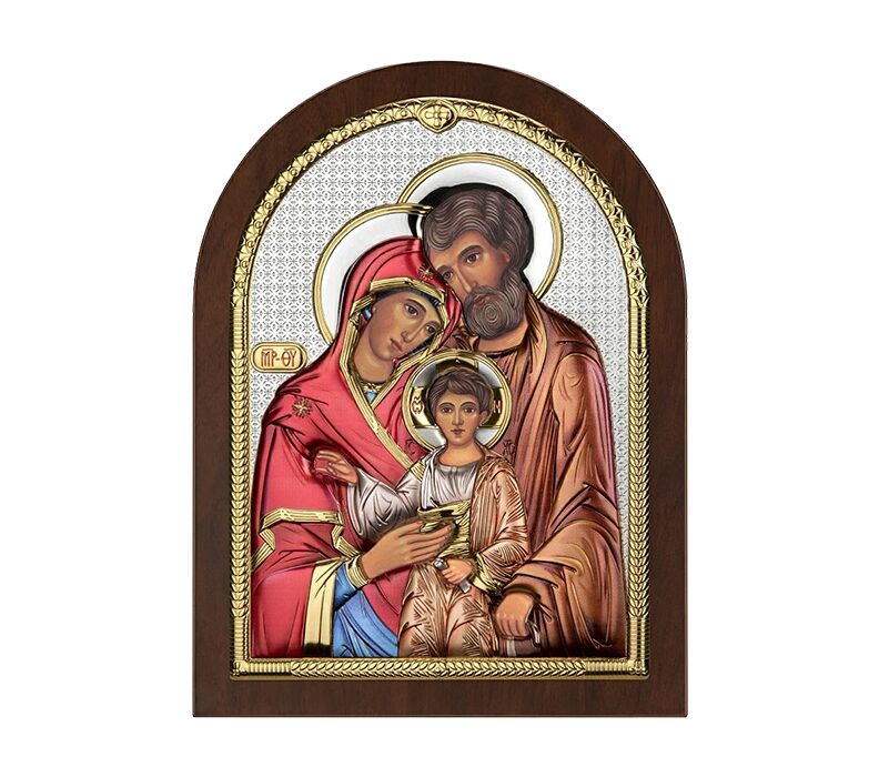 • Eine einzigartige Ikone, die die Heilige Familie darstellt – Maria, Josef und das Jesuskind. Sie wurde im traditionellen Stil mit Liebe zum Detail gefertigt. Die mit Silber überzogenen Elemente unterstreichen die Majestät und die spirituelle Bedeutung des Bildnisses, während die goldenen Akzente der Komposition Tiefe und Eleganz verleihen. Der Hintergrund, der mit einem subtilen, ornamentalen Muster verziert ist, bildet ein harmonisches Ganzes. Der bogenförmige Holzrahmen setzt einen zusätzlichen Akzent klassischer sakraler Kunst. Das Bild strahlt Wärme, Ruhe und Liebe aus und erinnert an den Wert der Familie und der spirituellen Verbundenheit.