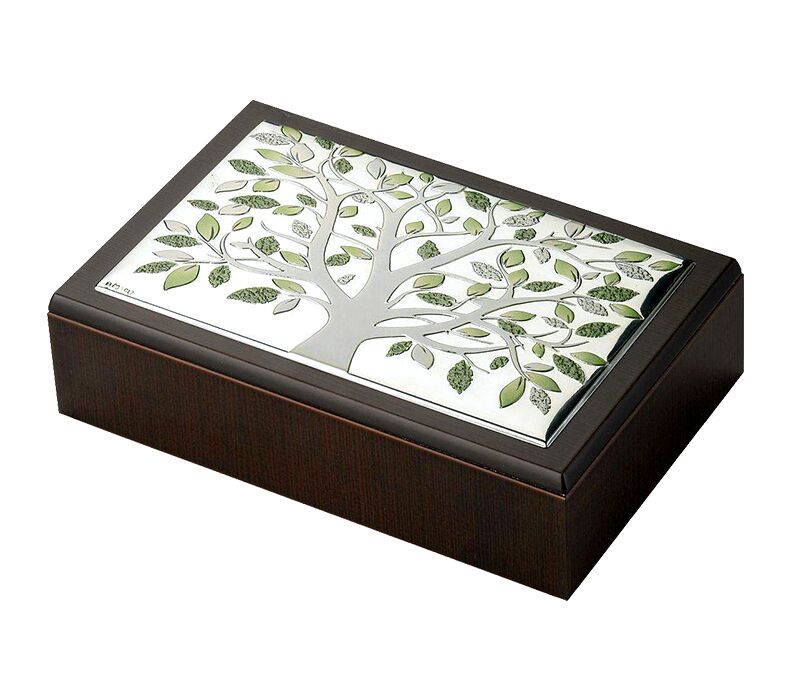 • Eine auffällige silberne Schmuckschatulle mit einem schönen, fein gearbeiteten Glücksbaummotiv, das Langlebigkeit und Glück symbolisiert. Die Schatulle eignet sich perfekt als einzigartiges Geschenk für geliebte Menschen zu verschiedenen Anlässen und bereichert jedes Interieur mit ihrem Glanz und ihrer Eleganz.