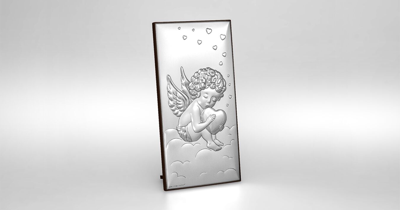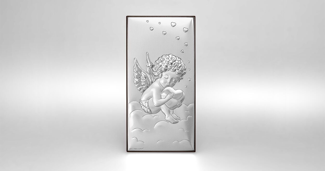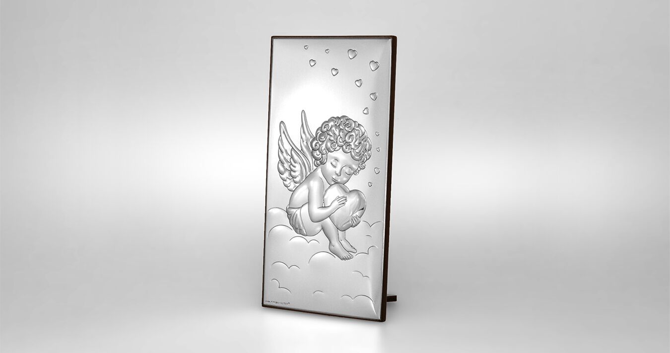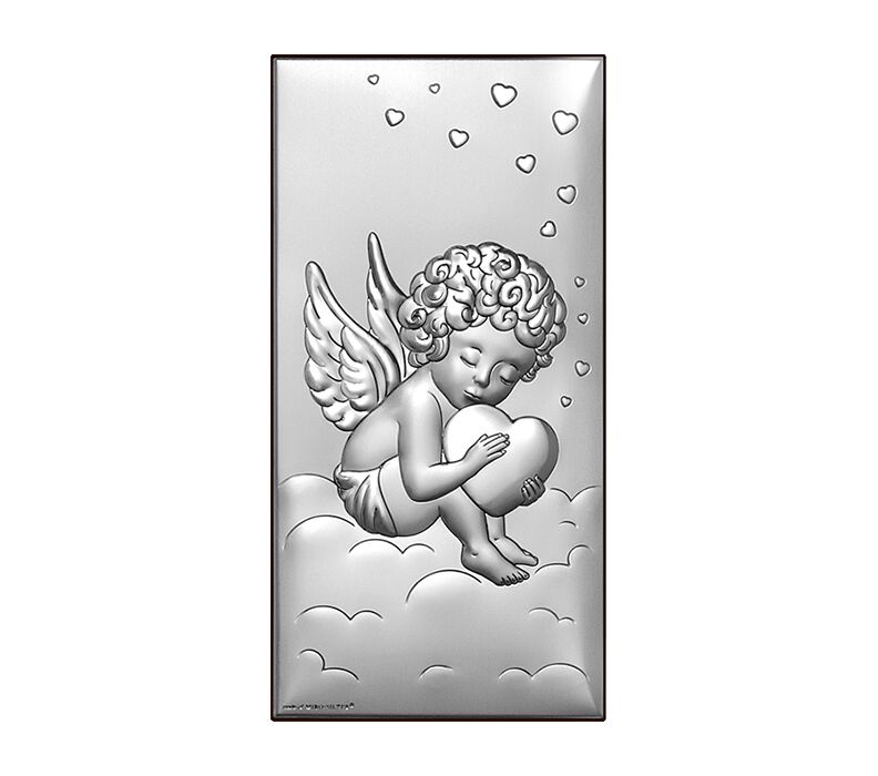 • Ein wunderschönes Silberbild mit einem Engel, der ein Herz hält. Ein wunderschönes silbernes Tauf- oder Neujahrssouvenir für ein Baby, das mit seinem Glanz jedes Kinderzimmer schmückt und eine Atmosphäre des Friedens und der Geborgenheit schafft.