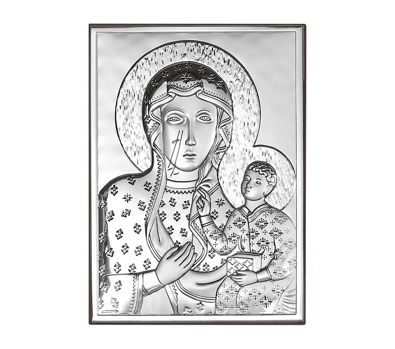 • Silberne Ikone Gottesmutter Schwarze Madonna von Tschenstochau der renomierten italienischen Firma Beltrami. Vorzügliches Andenken zur Hochzeit oder Hochzeitzur, Taufe oder Andenken zur Heiligen Erstkommunion.