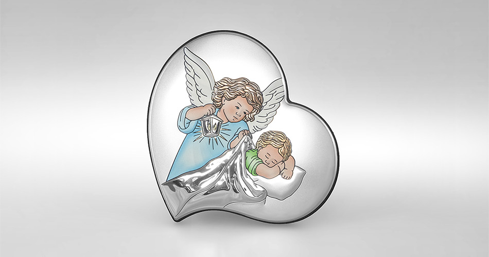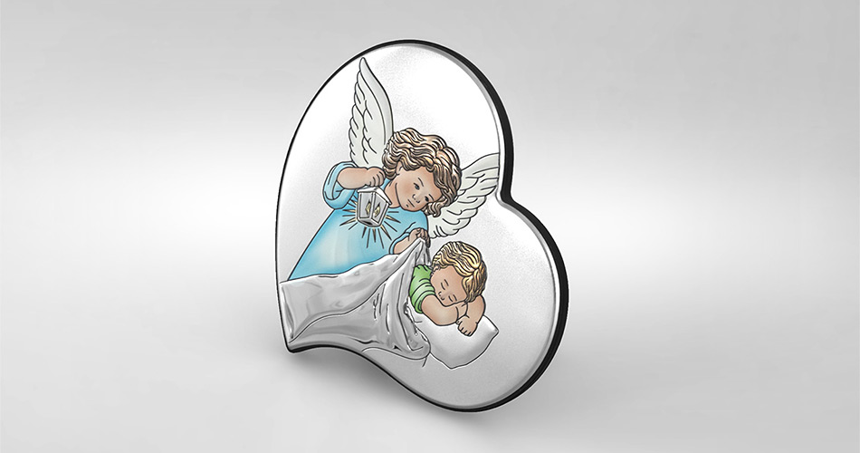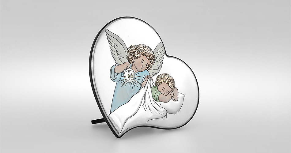 • Ein farbenfrohes Bild aus Sterlingsilber in einer Jungenversion mit einem Engel in Herzform. Das perfekte Tauferinnerungsstück für ein kleines Kind, das sich noch viele Jahre an seinem Charme erfreuen wird.