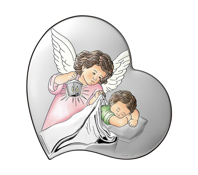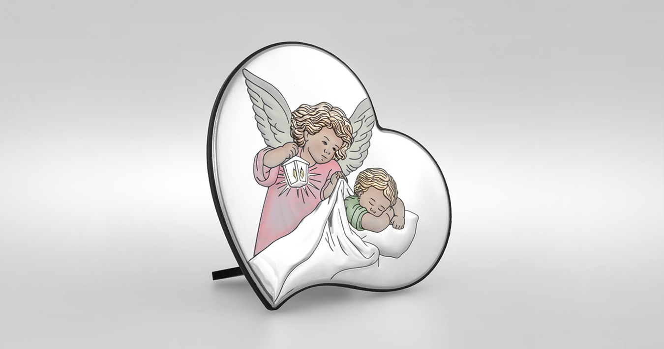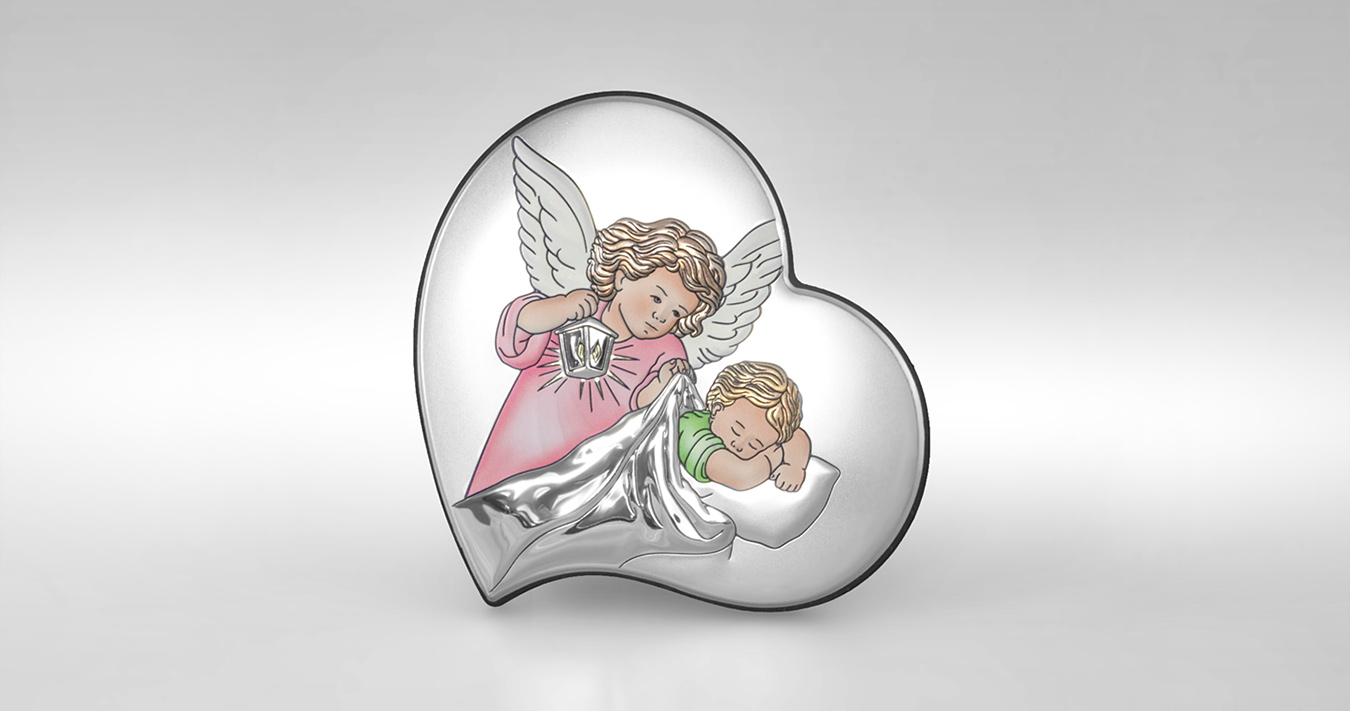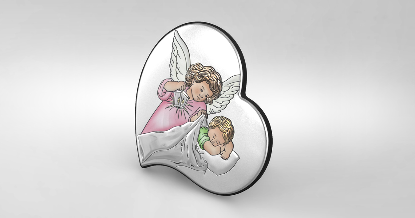 • Ein farbenfrohes Bild aus Sterlingsilber in einer Mädchenversion mit einem Engel in Herzform. Das perfekte Tauferinnerungsstück für ein kleines Kind, das sich noch viele Jahre an seinem Charme erfreuen wird.