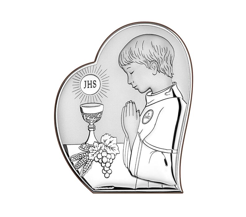 • Ein einzigartiges Silberbild der italienischen Marke Beltrami, entworfen für ein schönes Andenken an die Erstkommunion. Es zeigt einen betenden Jungen im Kommuniongewand, der sich um den eucharistischen Kelch mit der Hostie und dem IHS-Symbol schart. Die zarten Details und die feine Linienführung der Zeichnung verleihen ihr eine besondere Note und machen sie zum perfekten Andenken an die Erstkommunion.