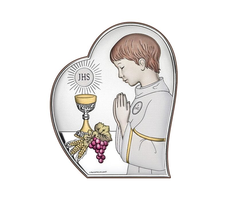 • Ein einzigartiges Silberbild der italienischen Marke Beltrami, entworfen für ein schönes Andenken an die Erstkommunion. Es zeigt einen betenden Jungen im Kommuniongewand, der sich um den eucharistischen Kelch mit der Hostie und dem IHS-Symbol schart. Die zarten Details und die feine Linienführung der Zeichnung verleihen ihr eine besondere Note und machen sie zum perfekten Andenken an die Erstkommunion.