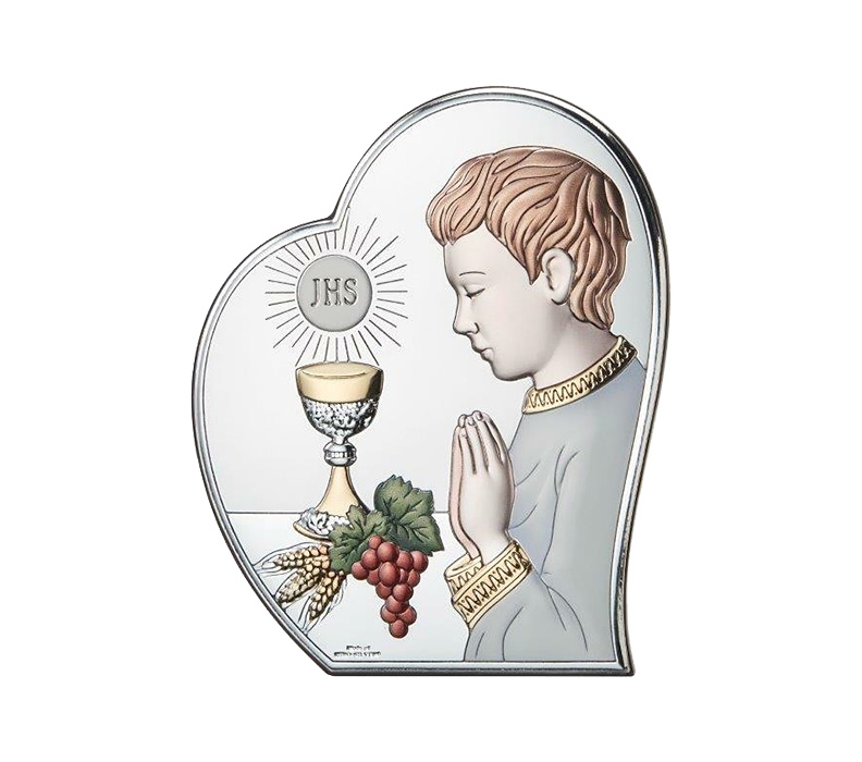 • Ein silbernes Kommunionsbild in Herzform mit einem betenden Jungen. Ein perfektes Geschenk zur Heiligen Kommunion für einen Jungen, das ihn an diesen besonderen Tag erinnern wird.