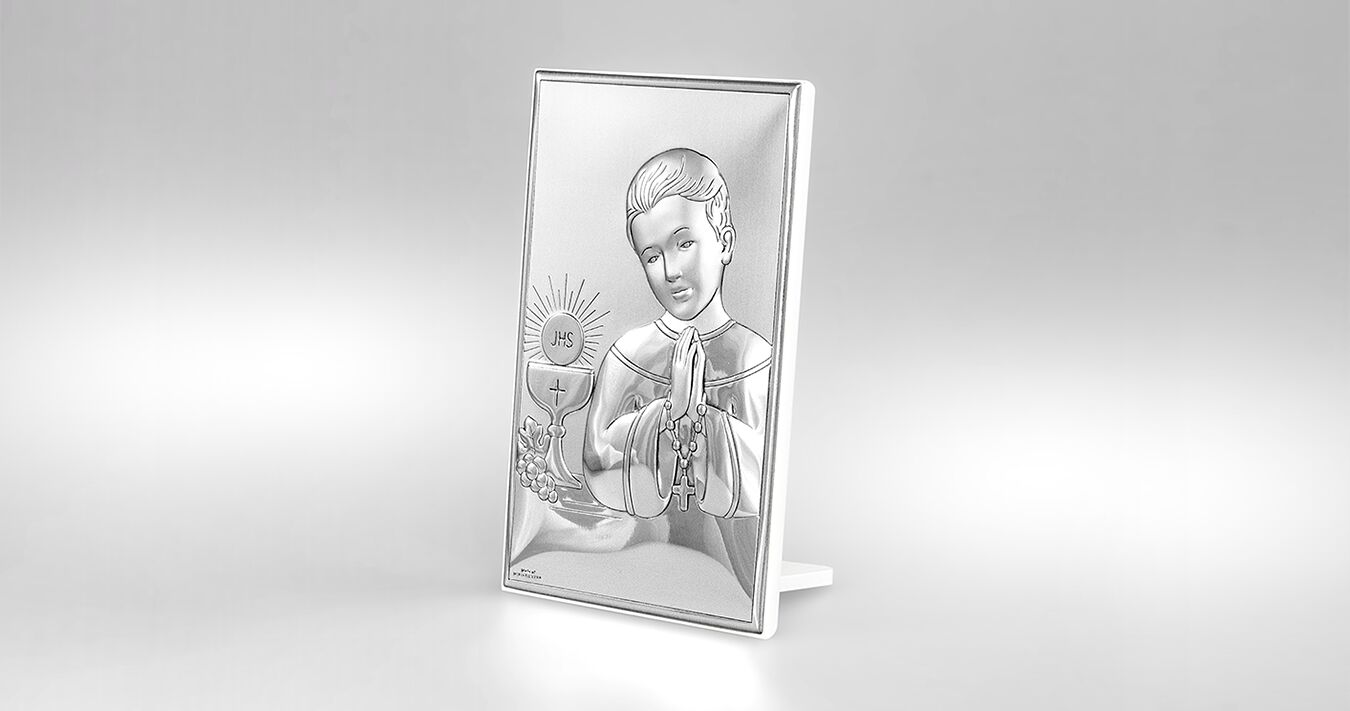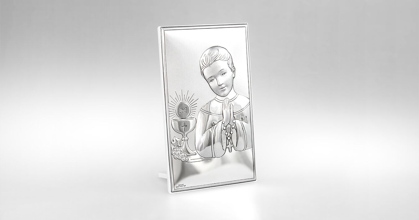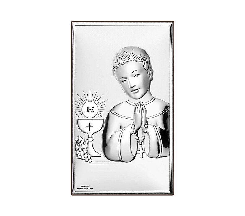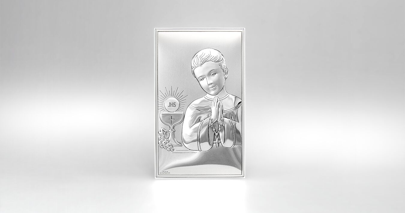 • Wunderschönes silbernes Bild mit der Darstellung eines betenden Jungen, der einen Rosenkranz in den Händen hält. Neben ihm steht ein eucharistischer Kelch mit Hostie und dem Symbol JHS. Ein perfektes Geschenk zur Ersten Heiligen Kommunion, das mit seinem Glanz noch viele Jahre an dieses besondere Ereignis erinnern wird.