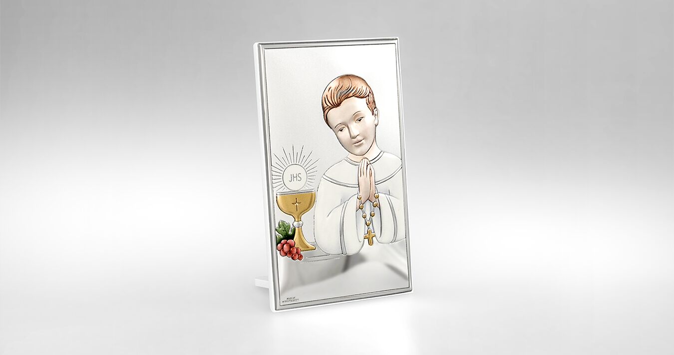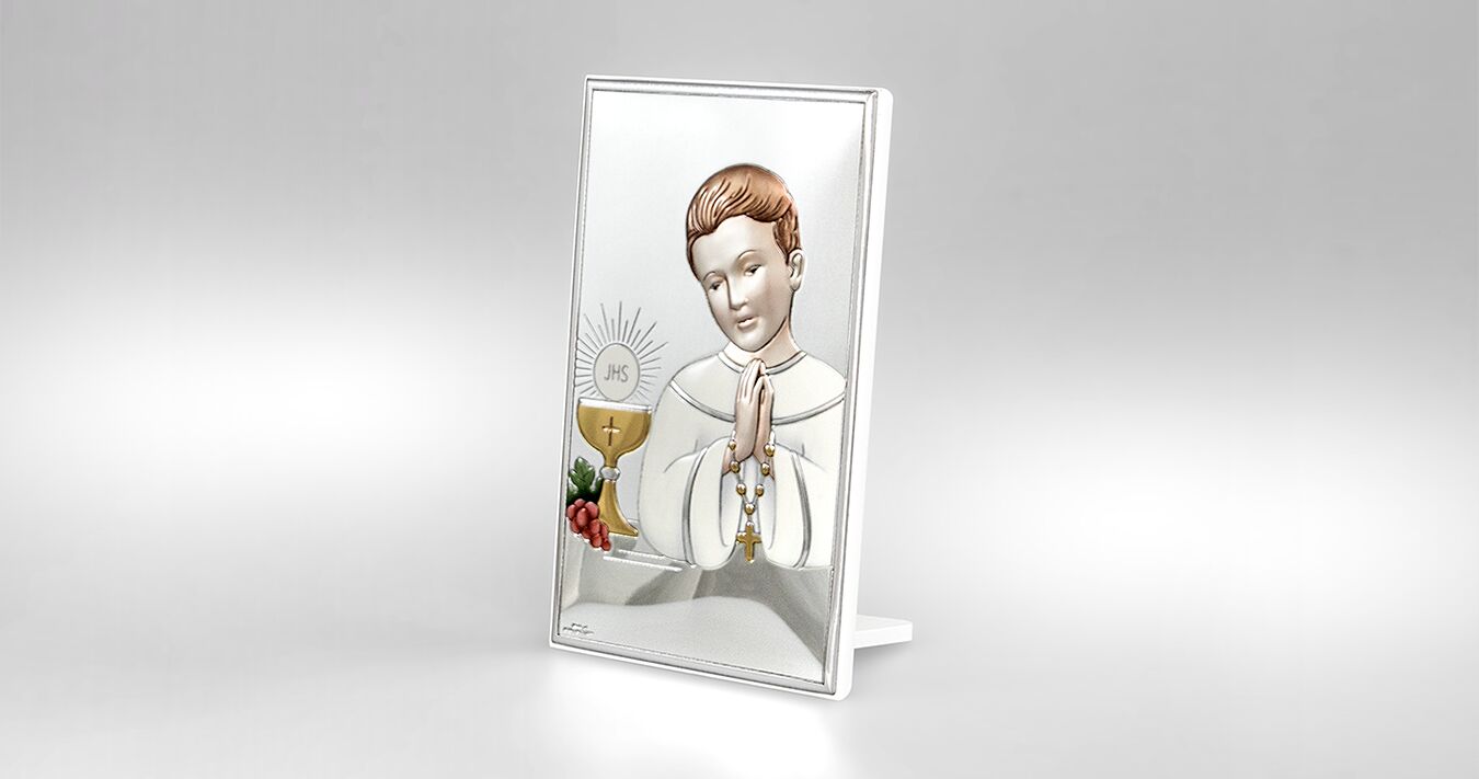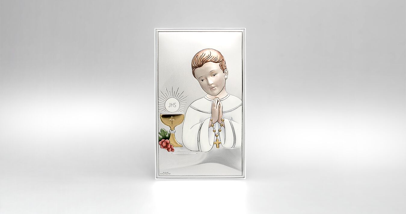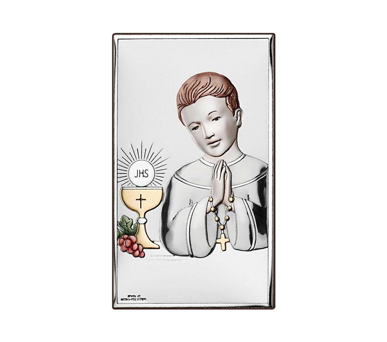 • Wunderschönes silbernes Bild mit der Darstellung eines betenden Jungen, der einen Rosenkranz in den Händen hält. Neben ihm steht ein eucharistischer Kelch mit Hostie und dem Symbol JHS. Ein perfektes Geschenk zur Ersten Heiligen Kommunion, das mit seinem Glanz noch viele Jahre an dieses besondere Ereignis erinnern wird.
