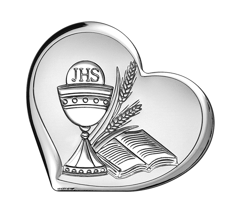 • Ein silbernes Kommunionsbild in Herzform mit einer Hostie. Ein perfektes Geschenk zur Heiligen Kommunion für ein Kind, das ihn an diesen besonderen Tag erinnern wird.