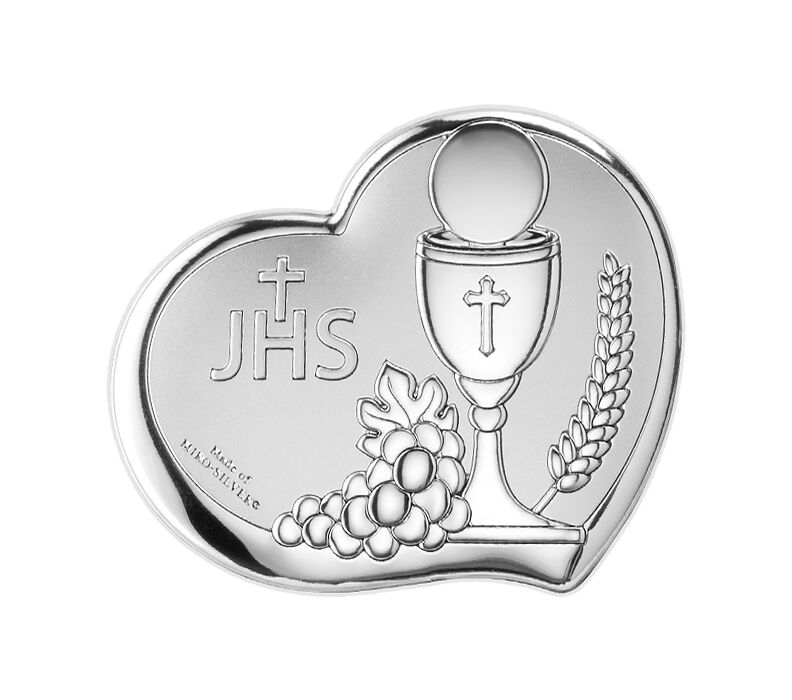 • Ein silbernes Kommunionsbild in Herzform mit einer Hostie. Ein perfektes Geschenk zur Heiligen Kommunion für ein Kind, das ihn an diesen besonderen Tag erinnern wird.