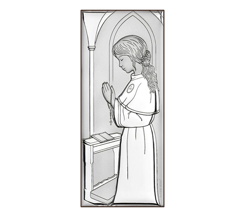 • Ein elegantes Silberbild, das ein Mädchen im Kommunionskleid zeigt, das in der Kirche ins Gebet vertieft ist.Die zarten Details und die feine Linienführung der Zeichnung verleihen dem Bild eine besondere Note und machen es zu einem perfekten Andenken an die Erstkommunion.