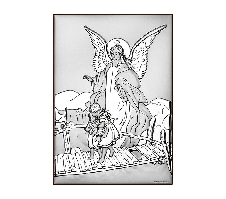 • Koloriertes Silberbild mit der Darstellung eines Schutzengels, der zwei Kinder behütet, während sie eine gefährliche Brücke überqueren. Ein Symbol für den göttlichen Schutz und die Fürsorge für die Kleinsten – und somit ein einzigartiges Erinnerungsstück fürs ganze Leben. Durch die sorgfältige Verarbeitung und die präzisen Details besticht das Bild durch seine elegante Optik und einen dezenten Glanz. Ideal als Geschenk zur Taufe, zur Geburt, zum ersten Geburtstag oder zu einem anderen wichtigen Ereignis im Leben eines Kindes.