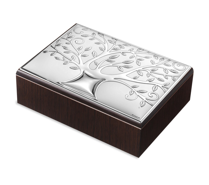 • Eine auffällige silberne Schmuckschatulle mit einem schönen, fein gearbeiteten Glücksbaummotiv, das Langlebigkeit und Glück symbolisiert. Die Schatulle eignet sich perfekt als einzigartiges Geschenk für geliebte Menschen zu verschiedenen Anlässen und bereichert jedes Interieur mit ihrem Glanz und ihrer Eleganz.